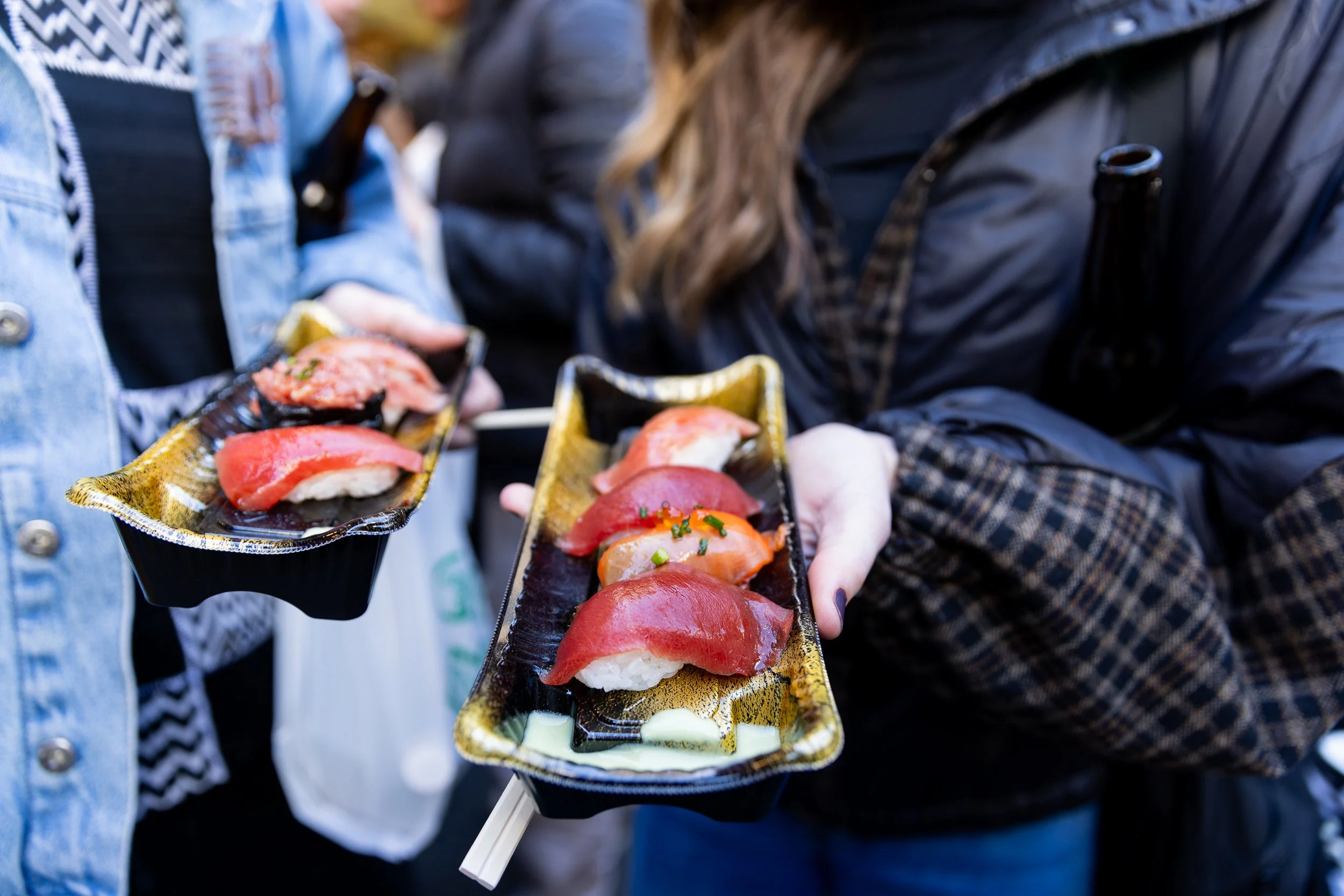 However, when you come for a food tour of Tsujiki Outer Fish Market that starts at 9am, smoothies are not on the menu, sashimi is. Yes, yes, it’s still healthy. But the amount one can consume when one dumps all caution in the sea, well, not healthy. Especially for my smoothie-downing partner. But hey, YOLO, right. We kicked off proceedings with a skewer of the finest Wagyu sourced from Hokkaido. It was served with a bit of Wasabi on the side. As I bit into it, the juices burst out into some kind of symphony that drowned out the babble around us. For a few minutes, everything was a blur. Just jaws chomping up and down rhythmically. We barely recovered from the experience when we were ushered into one of the teeming lanes. Kie, our guide, stopped in front of another outlet that reminded us why it’s called a fish market. We pointed out and plates of sushi, crab meat, nigiri, oysters found their way magically into our hands. Kie gave interesting bits of trivia, which we enjoyed at that moment, but now nothing comes to mind. This was basically the template of the tour – stop, eat, go, repeat. Entire mind, body and soul committed to the celebration of cuisine uncorrupted by words like fusion, experimental, Blumenthal, etc.